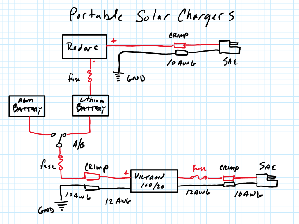 Update 08/2020: I originally connected to the solar controllers via SAE pigtails. That got annoying pretty quickly. I also observed that maintaining polarity and making sure that I didn’t over-volt the Redarc controller was unreliable. My solution was to build a small panel with SAE connections and a volt meter.