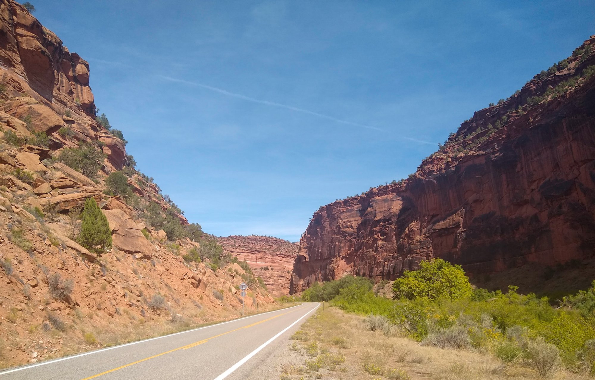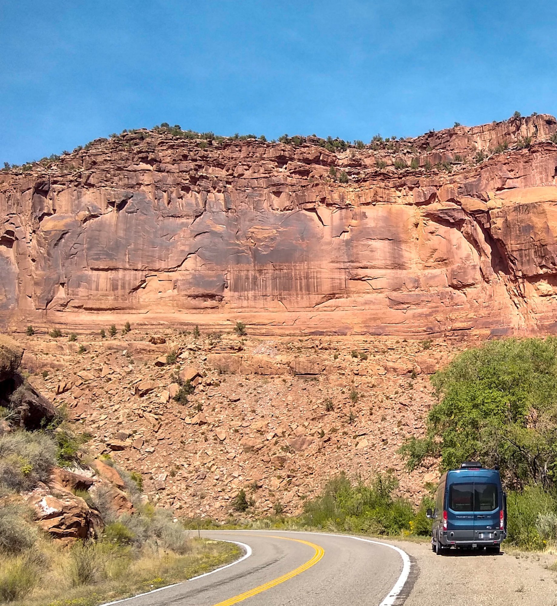 We ended up in the Colorado National Monument campground, not knowing that after a long day driving the bottom of thousand foot deep canyons we’d have twenty miles of driving on the rim of another deep canyon, this time on a narrow road at the edge of thousand foot cliffs. No guardrails either. The cliffs were on the passenger side, so I hugged the yellow line and didn’t look to the right.