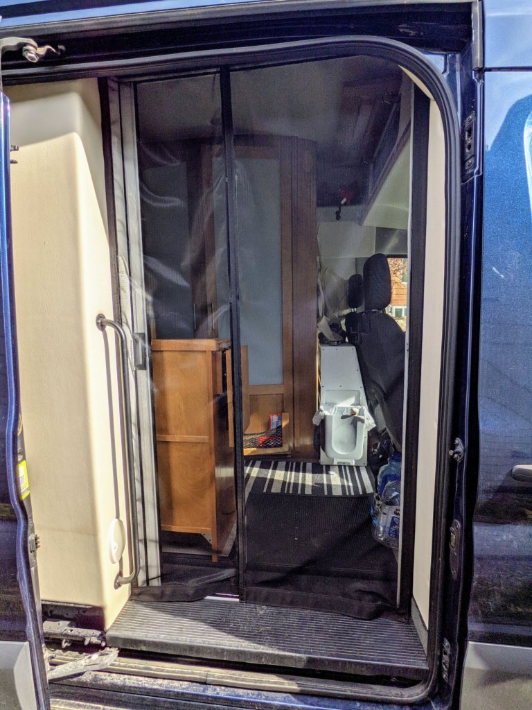 Cargo Door Bug screen: The camper comes with spring retracting, aluminum framed mosquito screens. The mechanism is the same as a roll-up window shade, with all of the same quirks. The cargo door screen closes from left to right. If you let go when opening or closing it’ll slam itself closed. If you are not careful it comes out of its track. Slipping in and out of the van without letting in bugs is hard, so we end up going through a bug-wacking ritual any time we have to open the screen at night. In short, it’s fiddly.