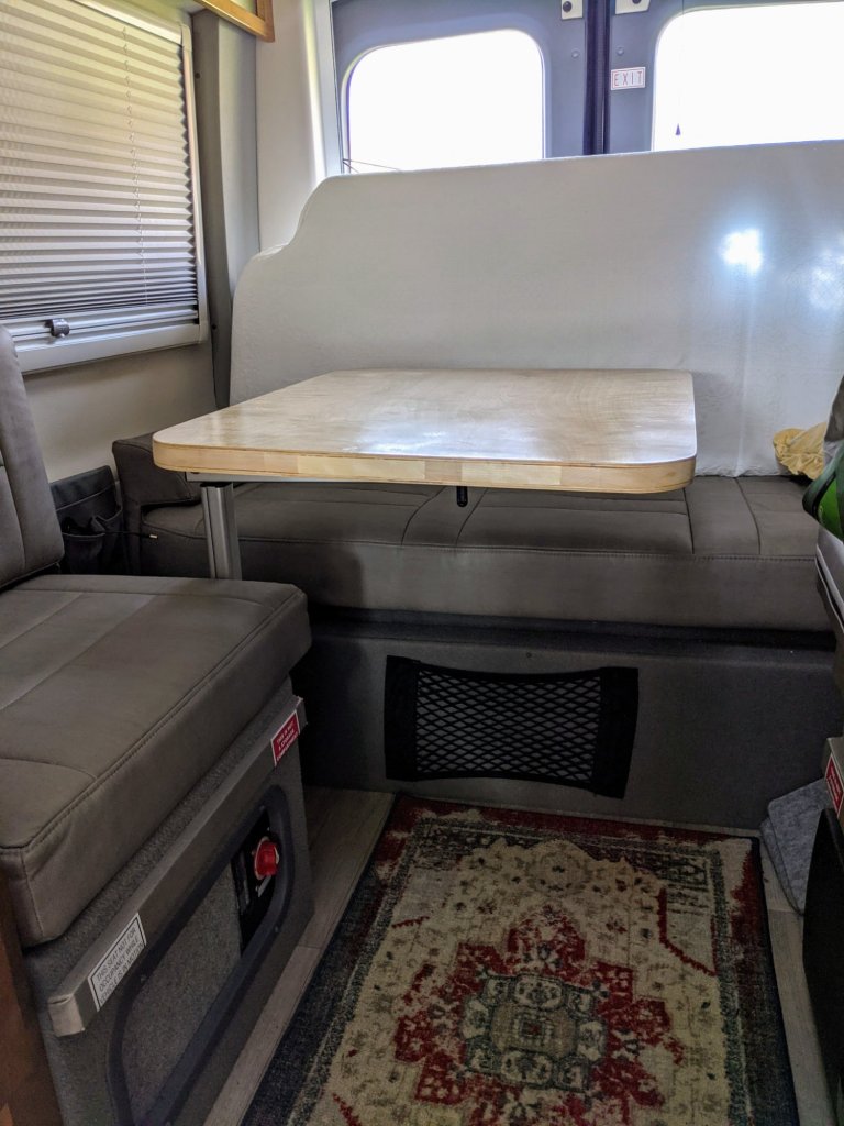 New table: The campervan came with a tiny, near useless 12″ x 28″ table and another 12″ x 28″ filler piece that made up the rest of the bed platform. Presumably they made it in two narrow pieces so that they could be stashed and fastened behind the couch, where they would not bonk someone on the head during an accident. But a 12×28 table is too small to eat from, so as soon as I got the camper home I made up a 24 x 28 table from solid aspen, and eventually a Lagun table mount. The new table & mount work fine. The table is a bit heavy though, so I made a another new table from a 1″ x 2″ aspen & 1/4″ birch plywood sandwich. This is the first time I tried gluing up something like this. It’s not perfect and it’s not as light as I thought it would be. But considering it’s just a prototype….