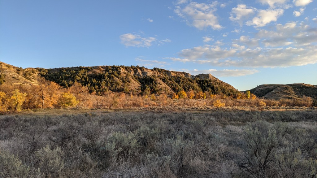 Our target for this trip was the North Dakota Badlands – I.E. Theodore Roosevelt National Park. After a couple days in North Dakota State Parks, we’re now camping in the National Park campground, situate in a cottonwood grove in the Little Missouri River valley. Like in Minnesota, there is a bit of fall color here also. Browns and yellows dominate, reds are scarce.