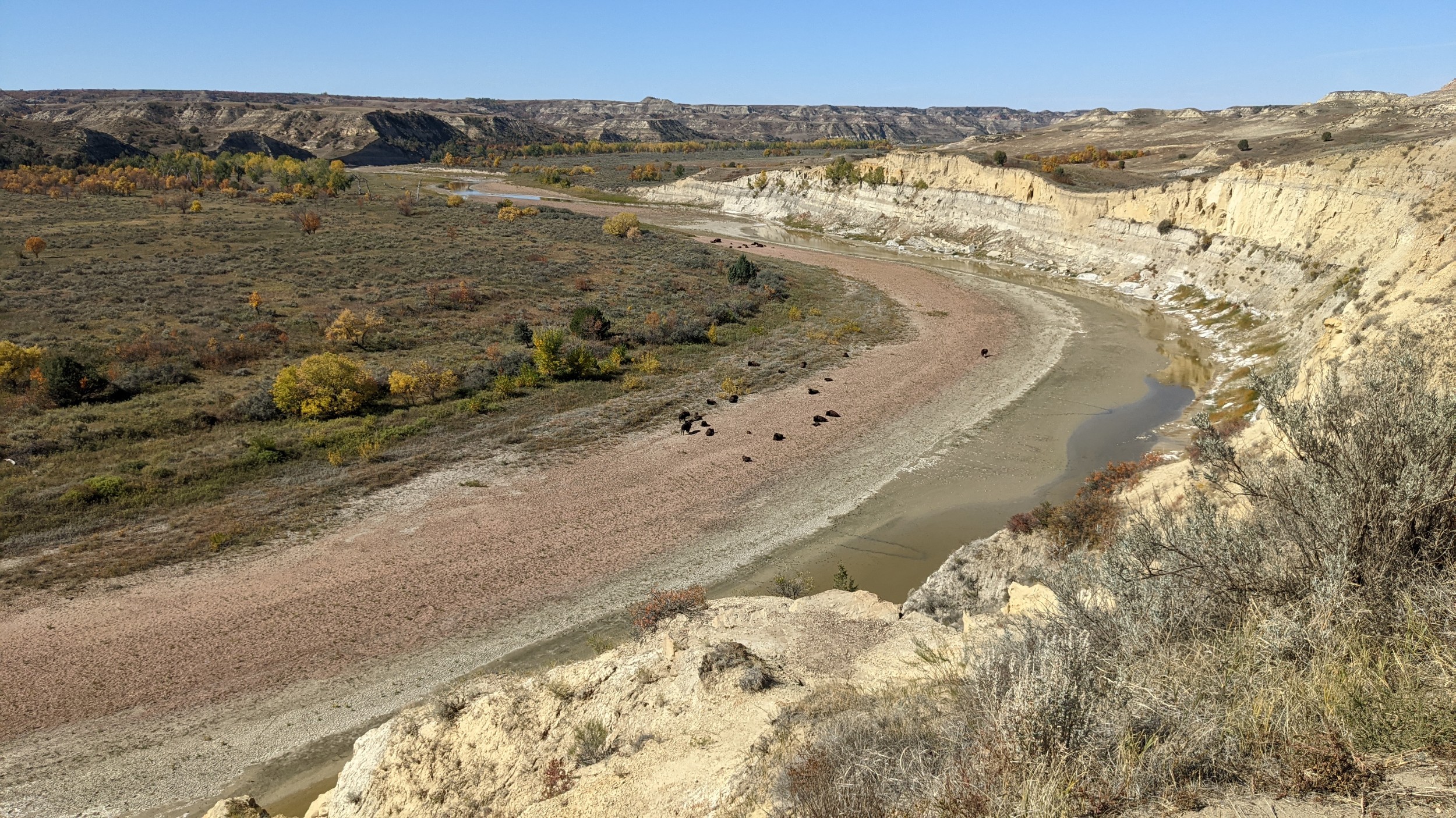 There are bison wandering around in the park. The Little Missouri River wanders through the park. Wandering bison like to wander around on the banks of the wandering Little Missouri River.