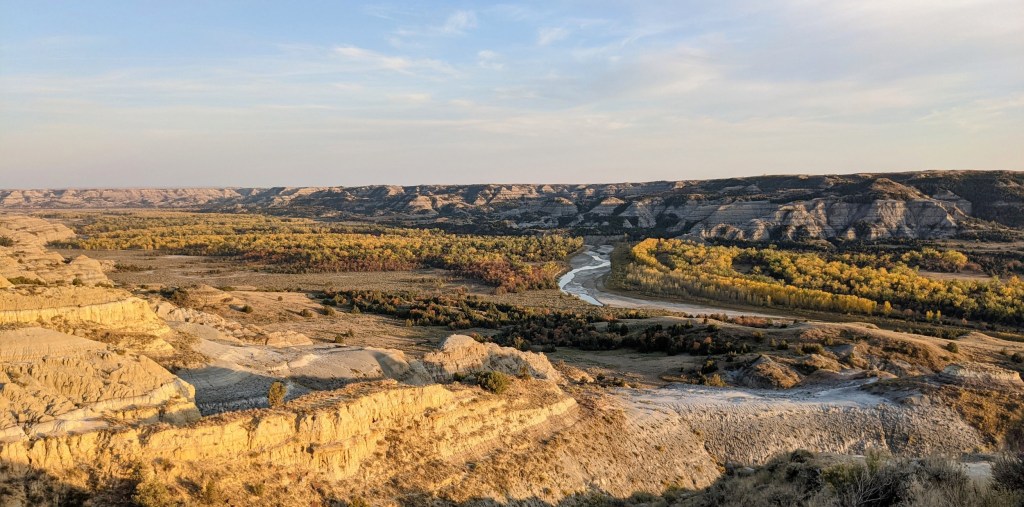 The view from the River’s Bend overlook is the nicest. It’s supposed to be the view that caused this part of the park to be designated as National Park. The Little Missouri River meanders through its valley, with cottonwoods lining the bank. Fall is nice here, and I’ll bet spring would be really nice too.