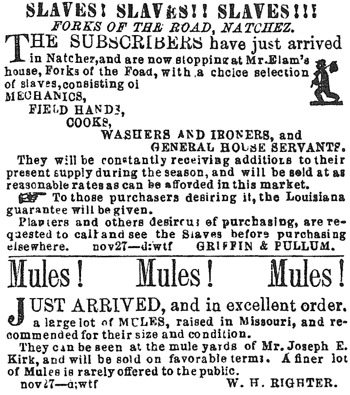 At the southern end of the Trace, Natchez, Mississippi became one of the commercial centers for the buying and selling of enslaved humans. Once the human cargo made it to Natchez the humans were sold at auction to whomever was willing to pay. To ensure that the trade in humans was fair to buyer and seller (but not the slaves), the State enforced a form of ‘satisfaction or your money back‘ on slave sales, called the right of redhibition.