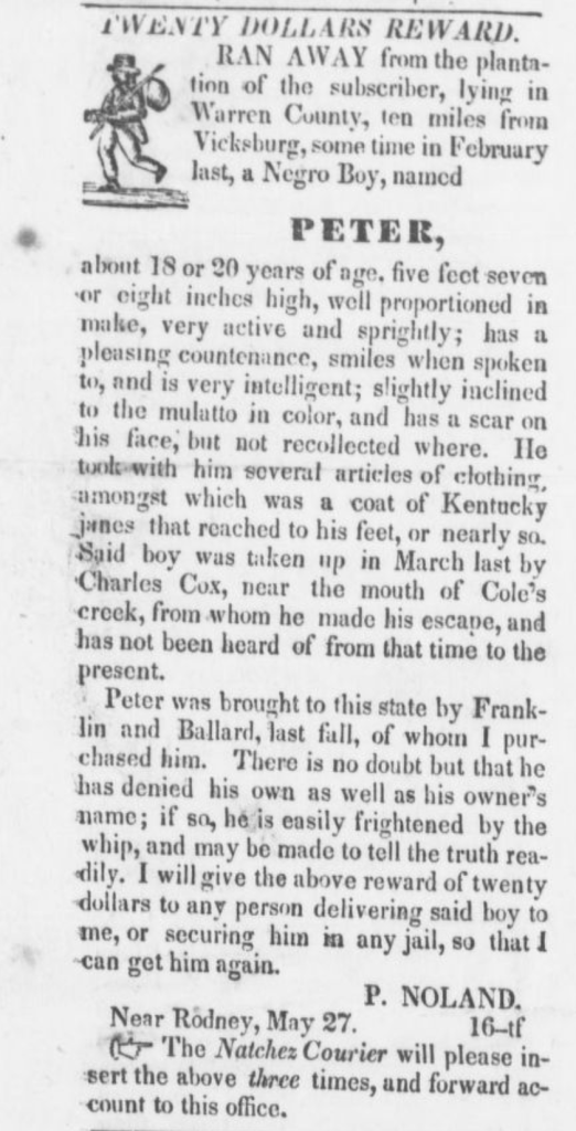 No word on whether Peter, the runaway slave in the advertisement below, made it to freedom.