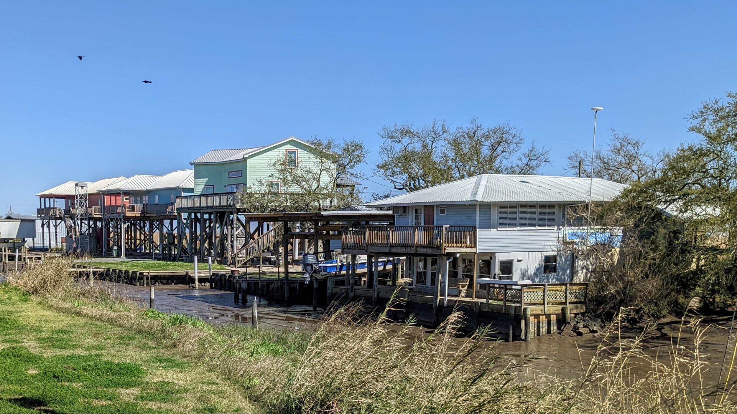 The road to the point gave us a flavor of this part of the gulf coast. It’s essentially all lowlands and salt marshes, interspersed with ‘islands’ a few feet higher than the surrounding land. The ‘islands’ might be populated, might have an extraction or other industry, or might be farmed (sugar cane, I think). It’s easy to see why an area like this would get flooded during a hurricane and why many houses are built on tall pilings – it’s barely above sea level and flat as a pancake.