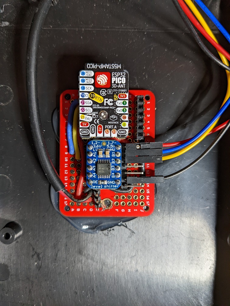 The ESP32 microcontroller is soldered into a small PC board and stuck to the back of the plastic box with a blob of silicone. I’m using a level shifter to drive the 5-volt Nextion serial port from the 3.3-volt ESP32 I/O pins.