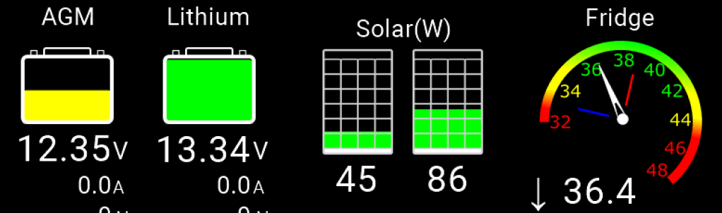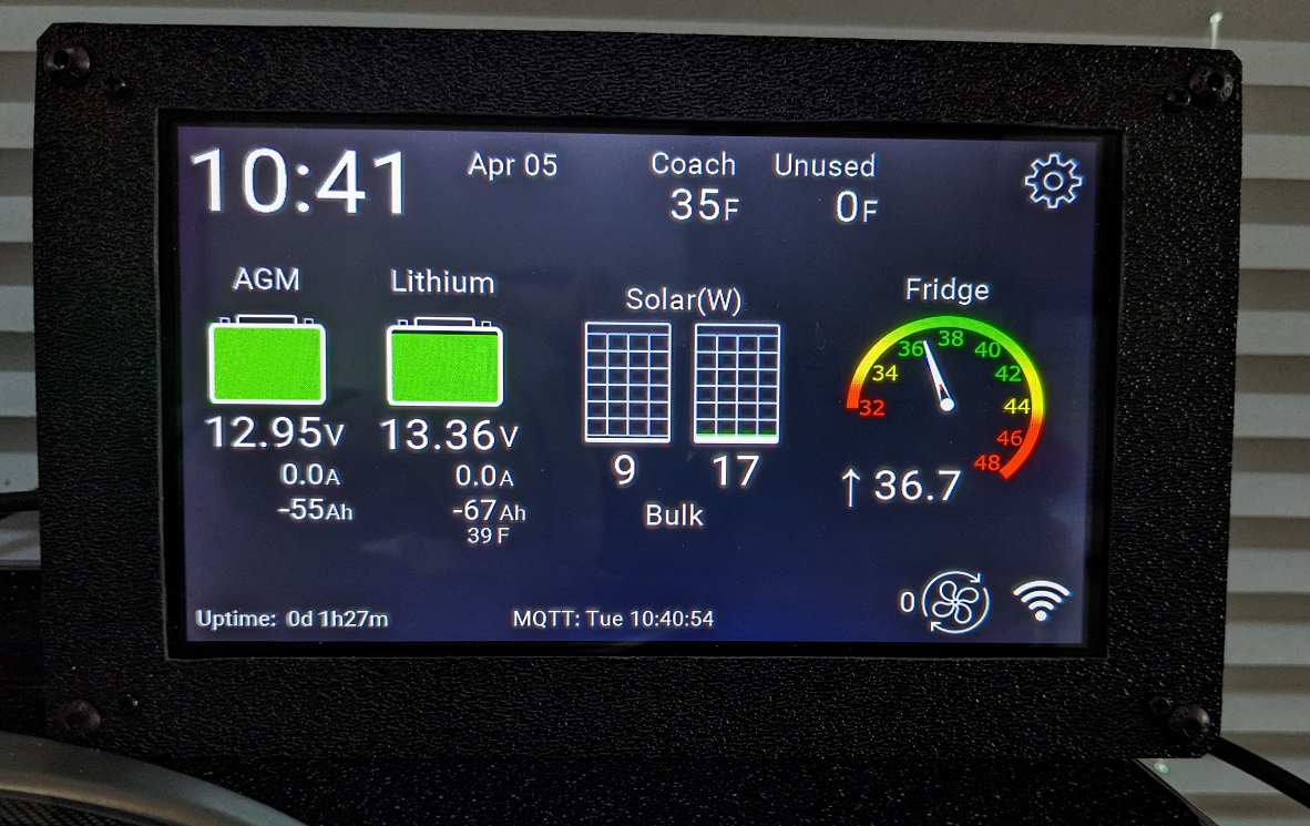 As of now, I have a couple of icons showing battery status (that change color to green/yellow/red & have charge/discharge indicators), solar panel output in watts, fridge temperature with min/max indicators, an animated icon showing fan speed, a WiFi status icon, and date/time & uptime fields. The ‘Gear’ icon switches to a screen that allows you to set the clock time & date, set the screen brightness, and sleep timeout.