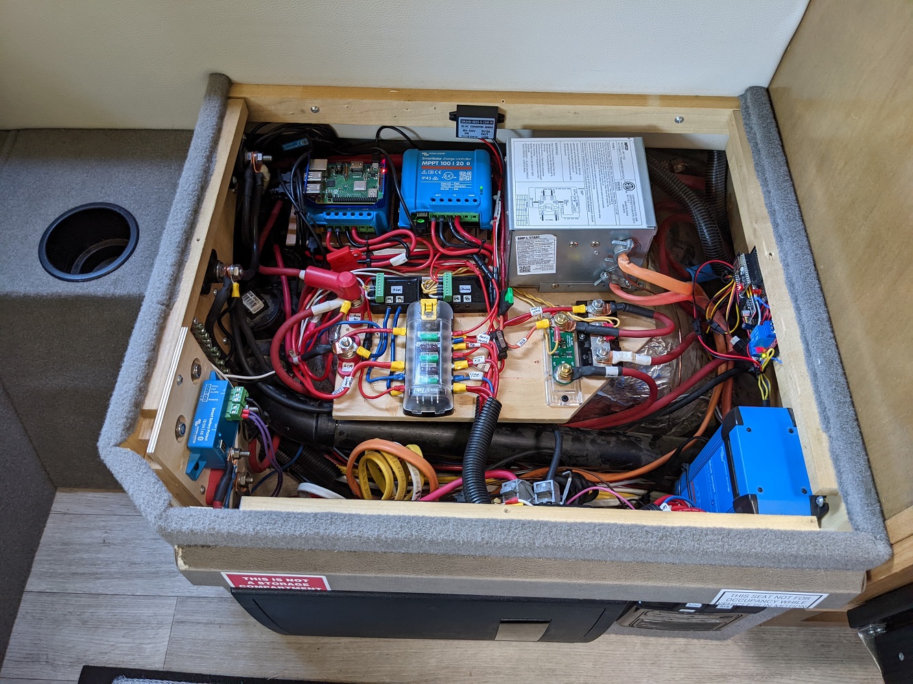 It’s larger than the old Battleborn – meaning I had to move a bunch of components to make room. Because I decided to run entirely from lithium and could simplify the electrical quite a bit, I figured it would be best to remove and re-wire most of what I’ve done over the last few years. That meant ripping out pretty much everything and starting over with new locations for the various components, a significant amount of rewiring and a bit of reprogramming and reconfiguring of my battery monitoring, IoT app & touch screen stuff. Nothing that a forty-hour week of kneeling on the floor in a hot-as-heck campervan couldn’t solve.