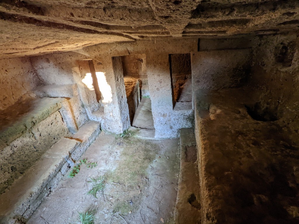 Near Villa San Giovanni in Tusca were elaborate Etruscan tombs carved into the side of a cliff, including one with two rooms.