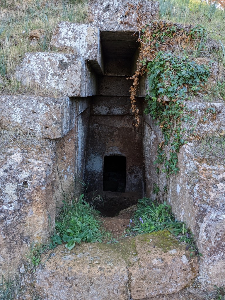 On our way back to Rome we stopped to visit an Etruscan Necropolis near Cerveteri. It was closed – it’s only open on weekends during off-season – so the finest tombs were not available for viewing. We took a short hike and found about a hundred tombs outside the official archeological site that were accessible.