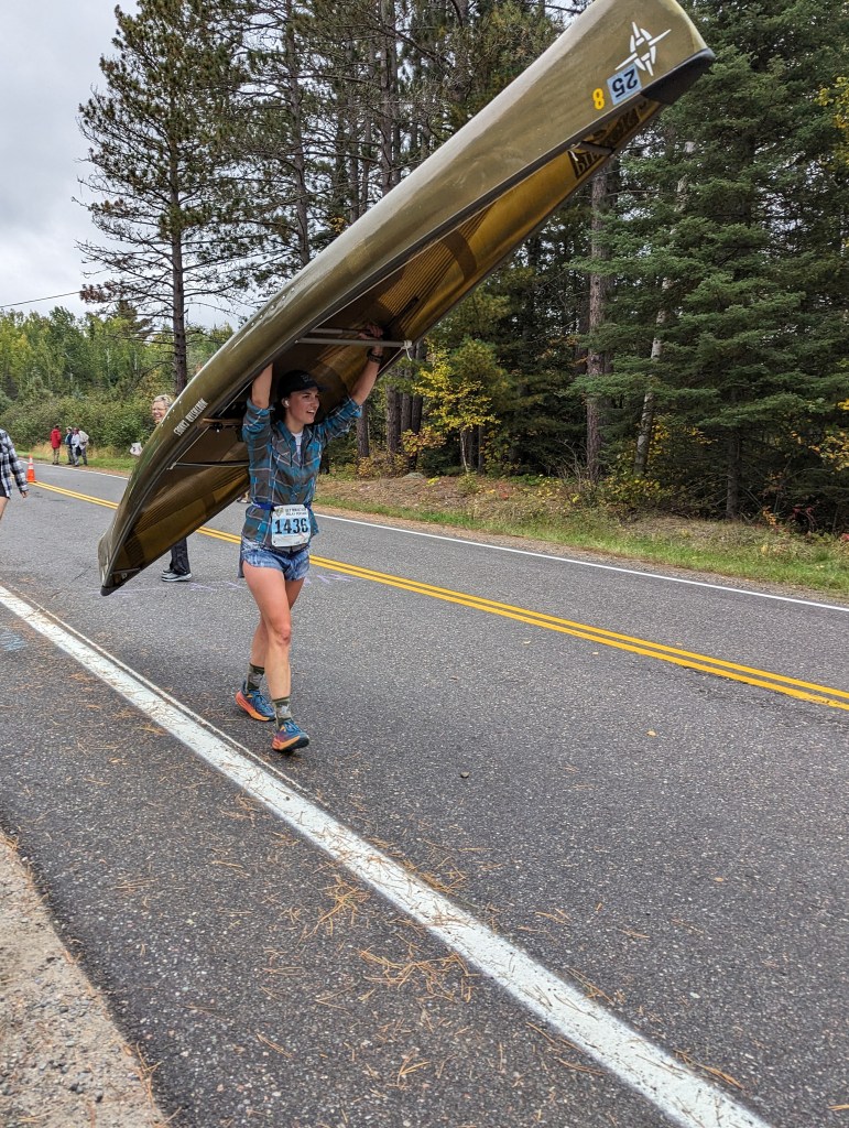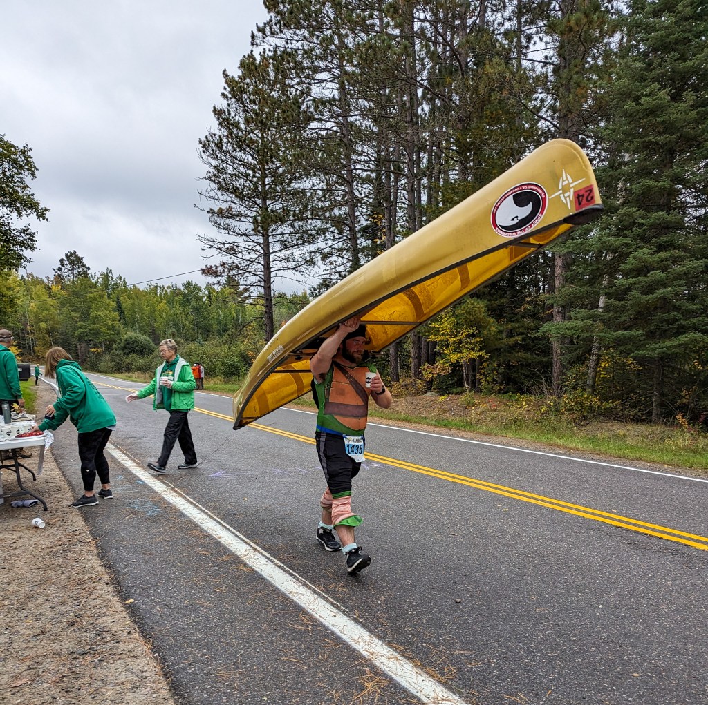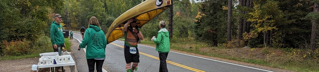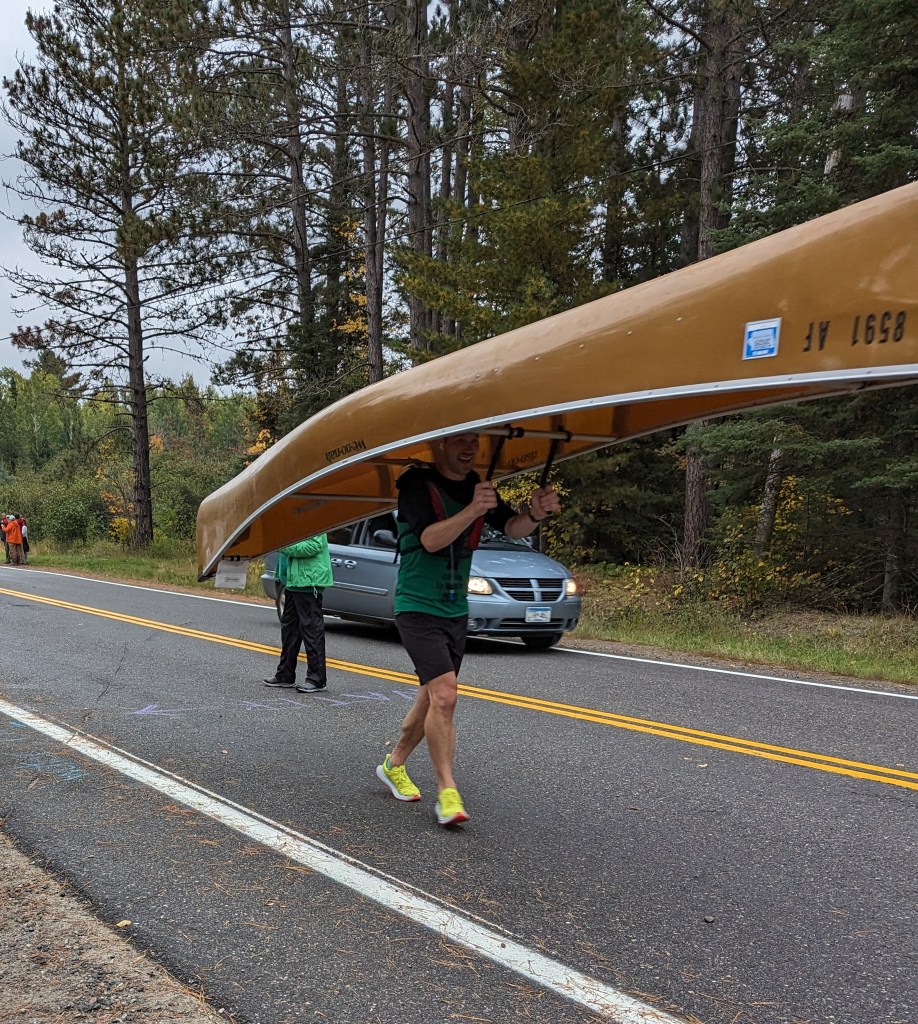 Ely Minnesota is a gateway to the Boundary Waters Canoe Area Wilderness, where outfitting and guiding is a significant contribution to the local economy. It makes sense then, that the annual Ely Marathon has a ‘Portage’ class where runners portage their canoes (I. E. run with canoes on their shoulders). Portagers can run a full marathon, half-marathon or a multi-runner relay.