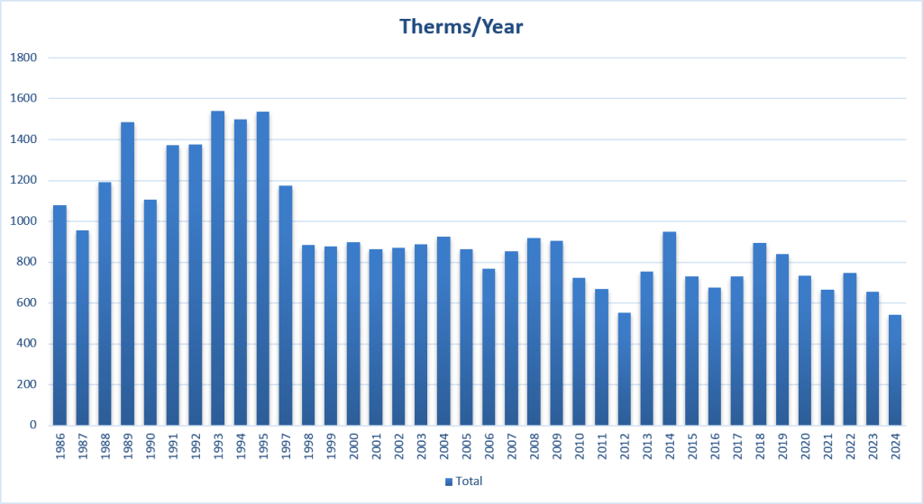 I’m interested in energy efficiency – I’ve been tracking my household electricity & natural gas cost and usage since the 1980’s. I’ve also been tracking household energy efficiency by plotting natural gas use (therms) vs. outdoor temperature (heating degree days).