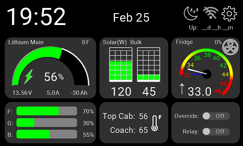 As built, the Coachmen Crossfit was not equipped with a system for monitoring power or battery levels. Additionally, as outlined in several blog posts, we had issues maintaining proper refrigerator temperature. To help monitor the refrigerator and to monitor and manage power utilization and battery levels, I created a monitoring system using custom firmware on ESP32 microcontrollers, and open-source software running on a Victron Cerbo GX. Most of that system is described in a series of technology related posts. This page will attempt to consolidate those posts into a single description of the various electronic systems.