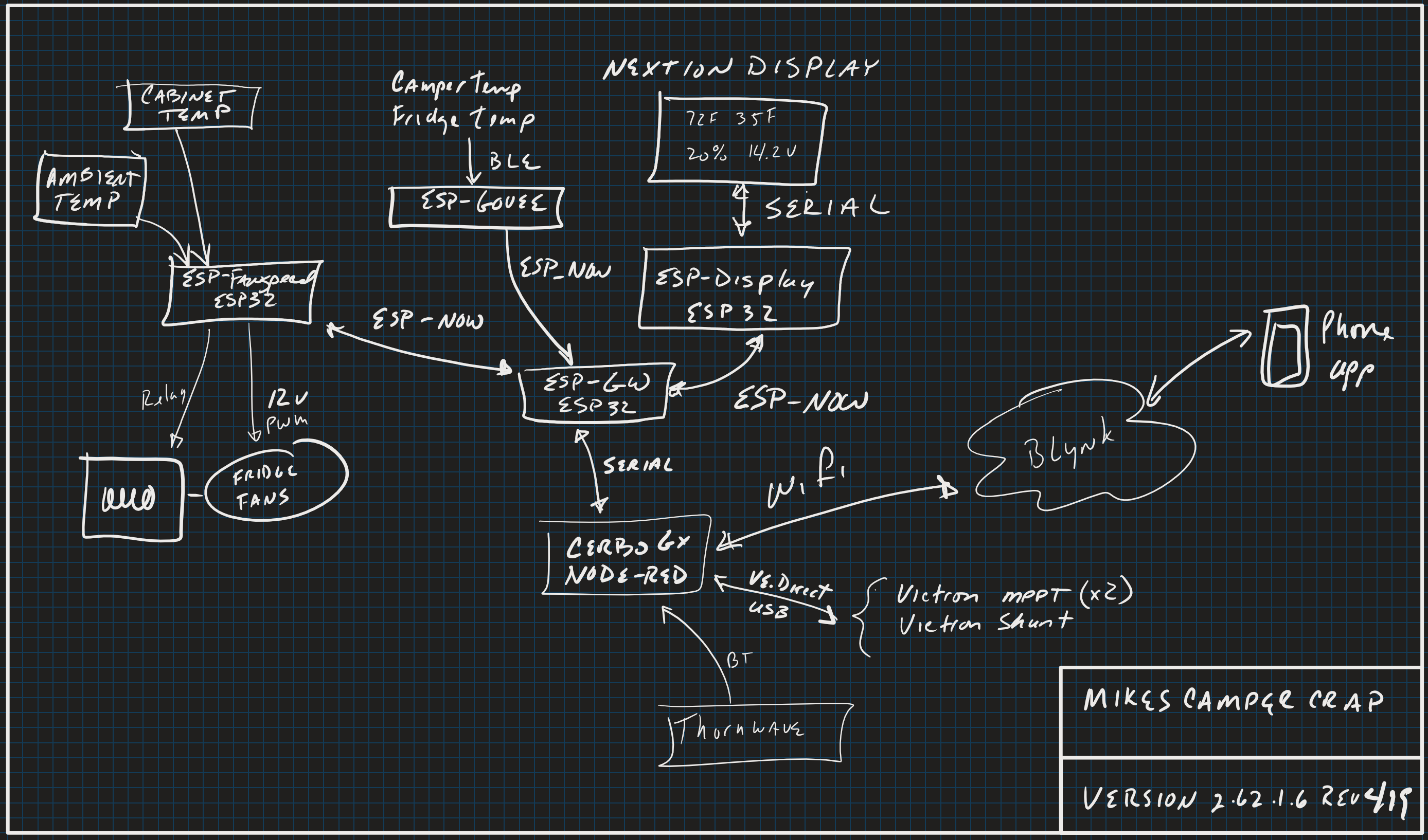As built, the Coachmen Crossfit was not equipped with a system for monitoring power or battery levels. Additionally, as outlined in several blog posts, we had issues maintaining proper refrigerator temperature. To help monitor the refrigerator and to monitor and manage power utilization and battery levels, I created a monitoring system using custom firmware on ESP32 microcontrollers, and open-source software running on a Victron Cerbo GX. Most of that system is described in a series of technology related posts. This page will attempt to consolidate those posts into a single description of the various electronic systems.